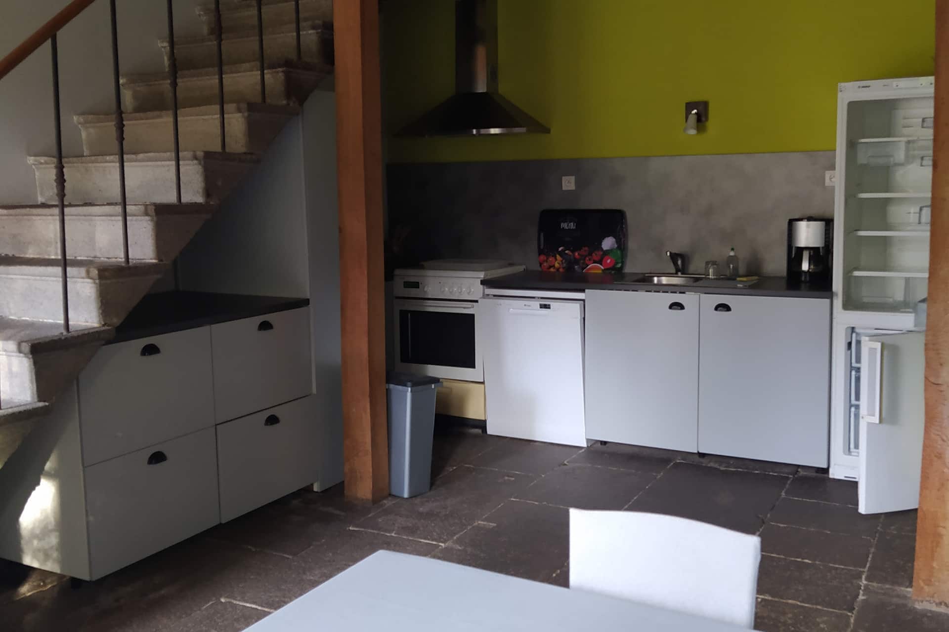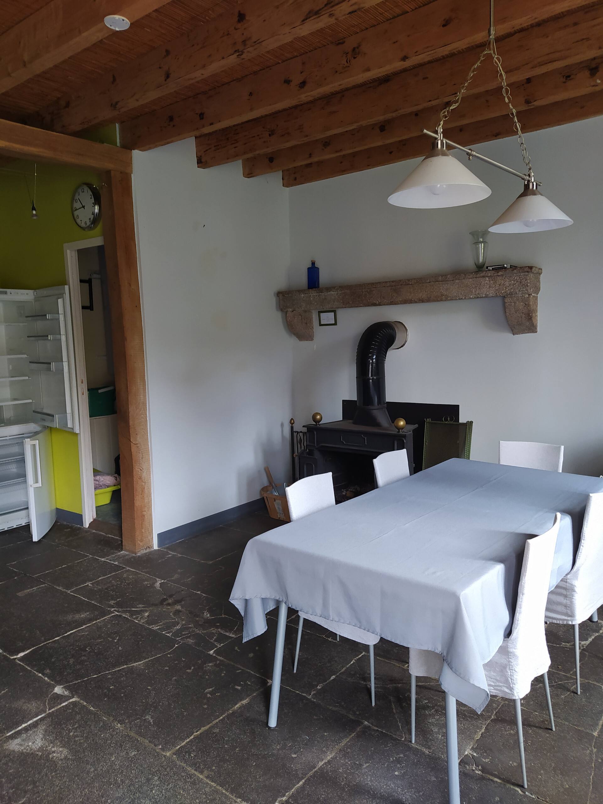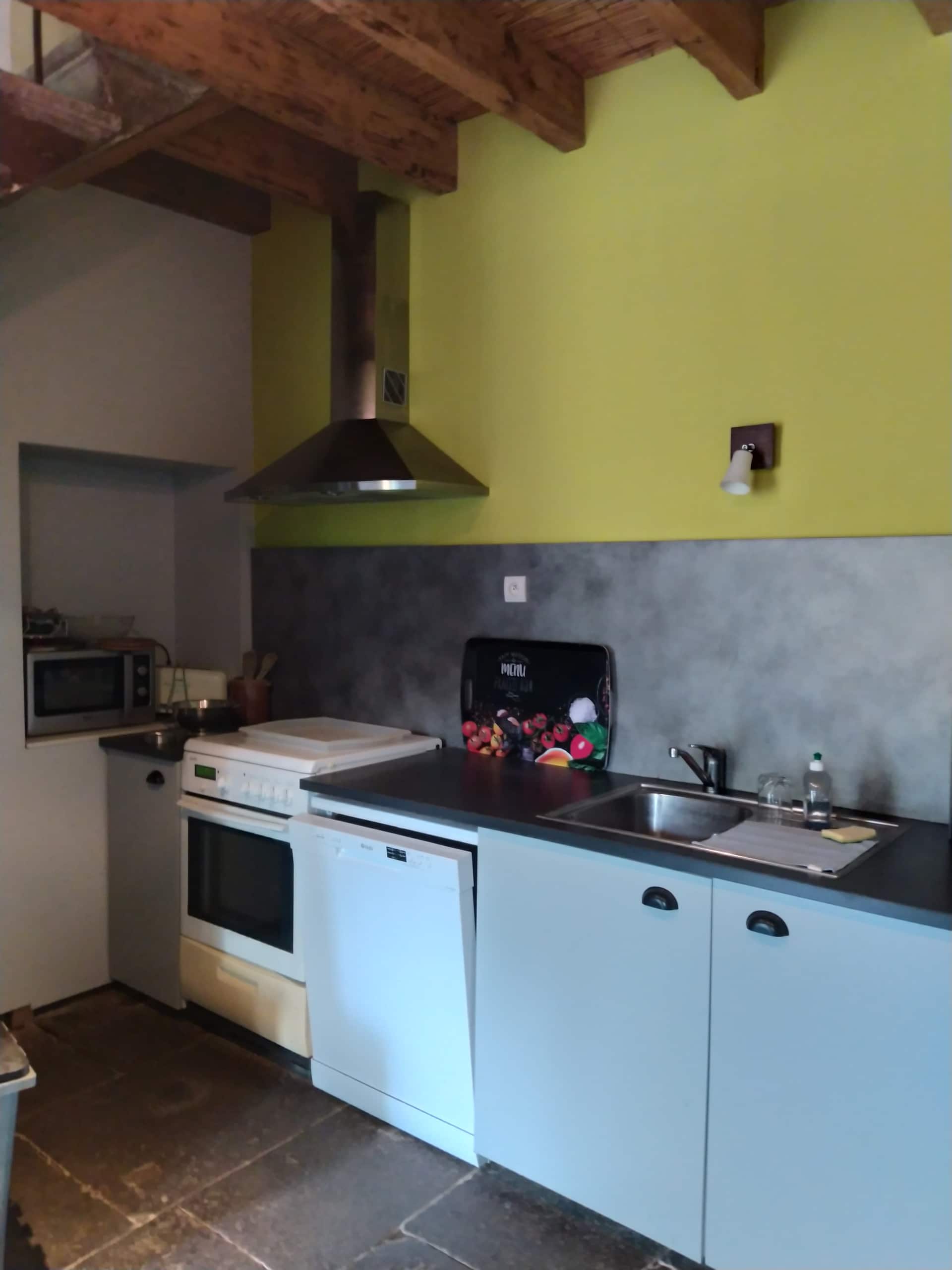 – 1 salon avec TV (10 m2) et une cuisine équipée ouverte de 15m2 (avec lave vaisselle) sur la salle à manger possédant un grand poêle à bois (bois fourni en supplément)