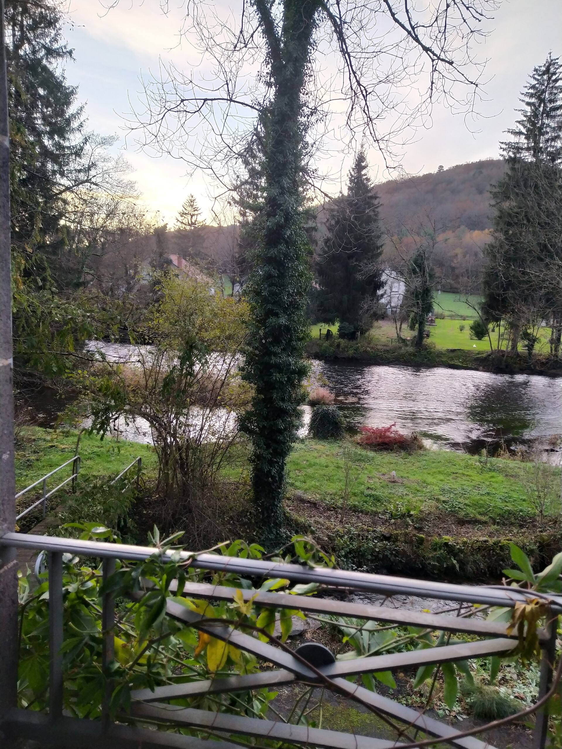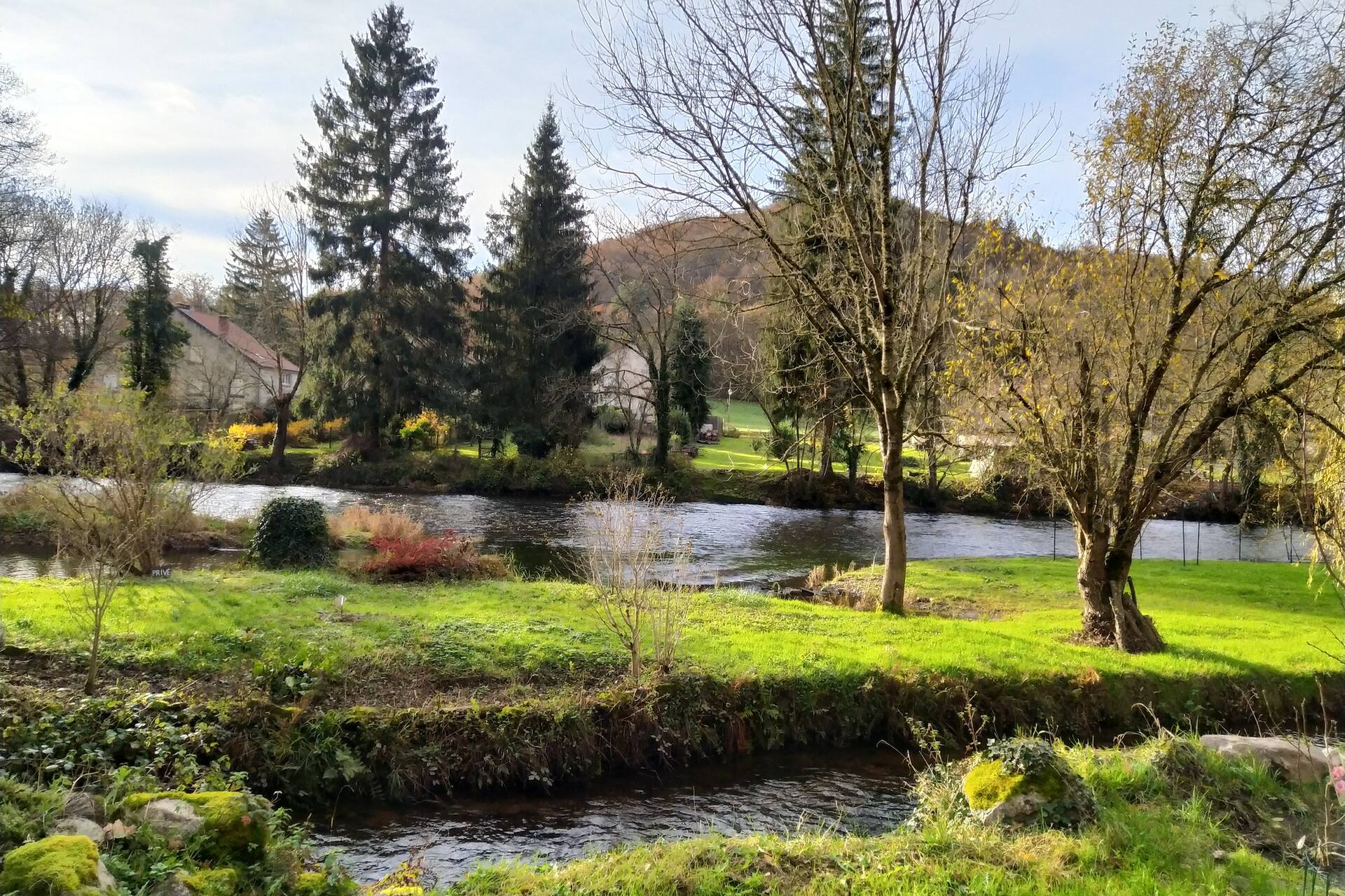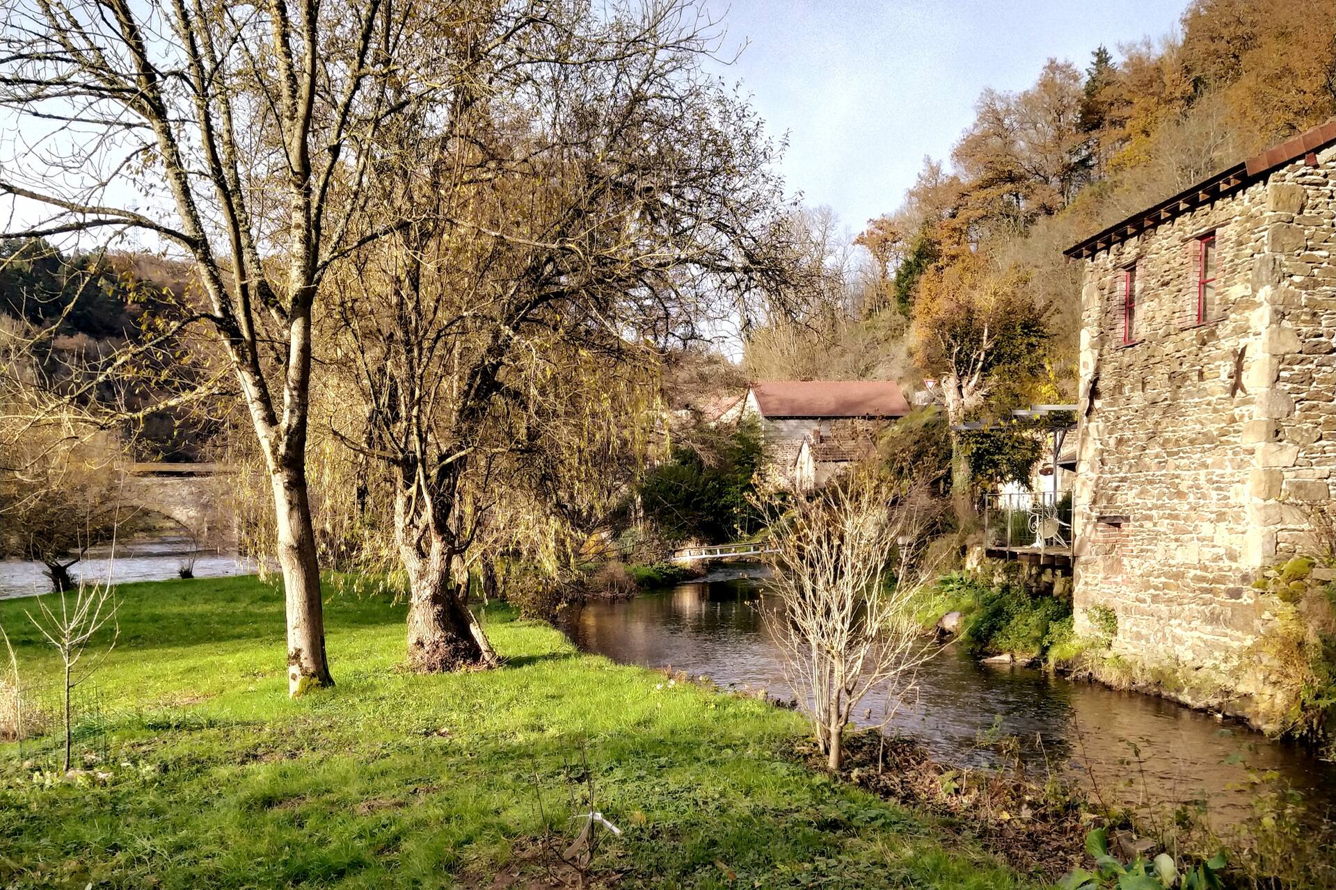 Le gîte a son accès à son terrain et à la rivière par une passerelle privée. C’est une île, située entre un petit canal (le bief) et la rivière elle-même.